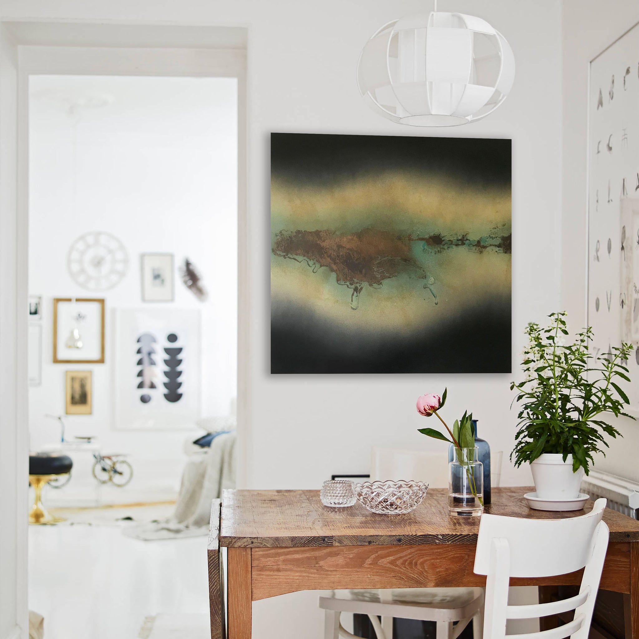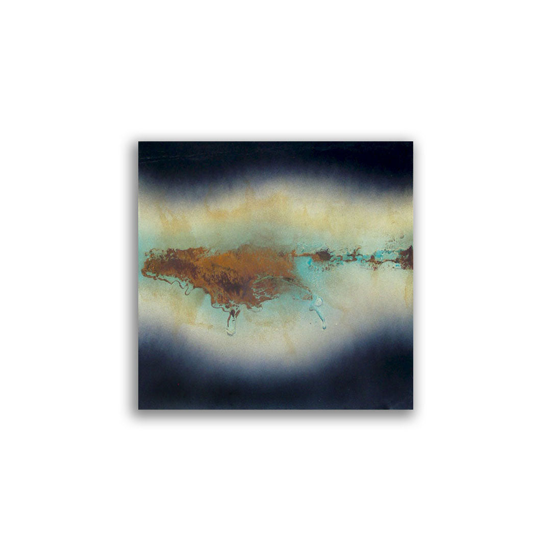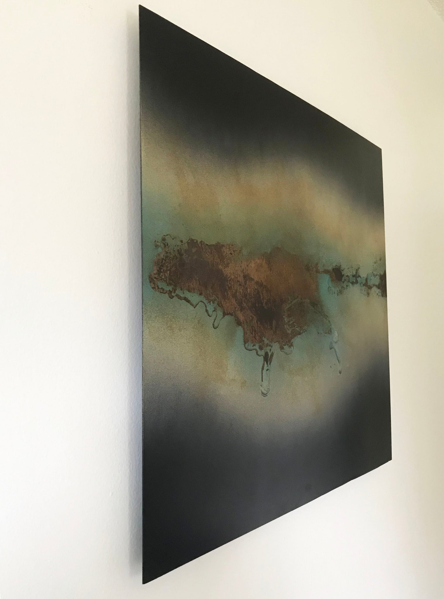 “Midnight Cosmos” is created from steel, paint and patina. Resists and paints are applied to the metal and allowed to dry. Patinas are applied next and allowed to work their magic in the voided paint areas. Each piece is then finished with a satin sheen and waxed. This piece in constructed in a way to give a floating appearance.